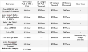 Rates listed below are for each microscope. For Full-Service imaging rate is $250/hour